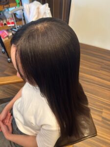このゲスト様に限らず、顔周りは基本的に周りの髪と比べて細くてデリケートな場合が多いので、場合によっては顔周りのみ弱めの薬剤に切り替えます。